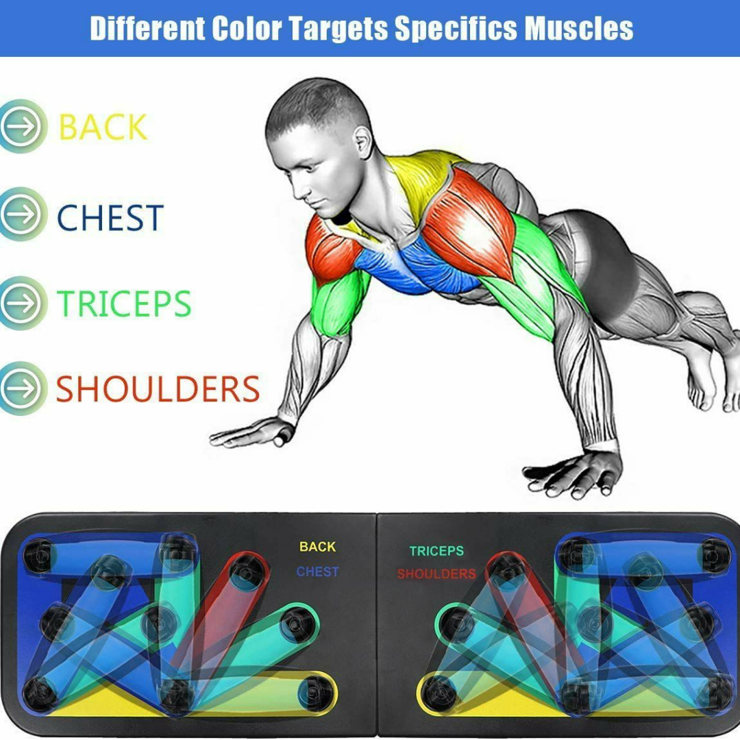The ""Plug and Play"" push-up board system provides the required exercise position and the right angle to effectively shape the upper body muscles.
